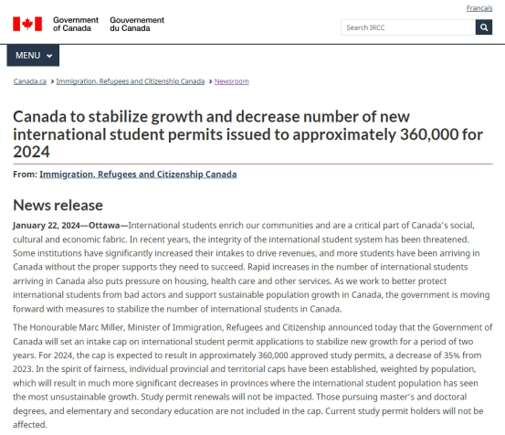 1. 加拿大政府将对学签申请设定招生上限,2024年该上限预计批准的学签量约为360,000个,比2023年减少35%。硕士、博士和中小学生不计入上限。目前的学签持有者不会受到影响,学签续签也不会受到影响。
